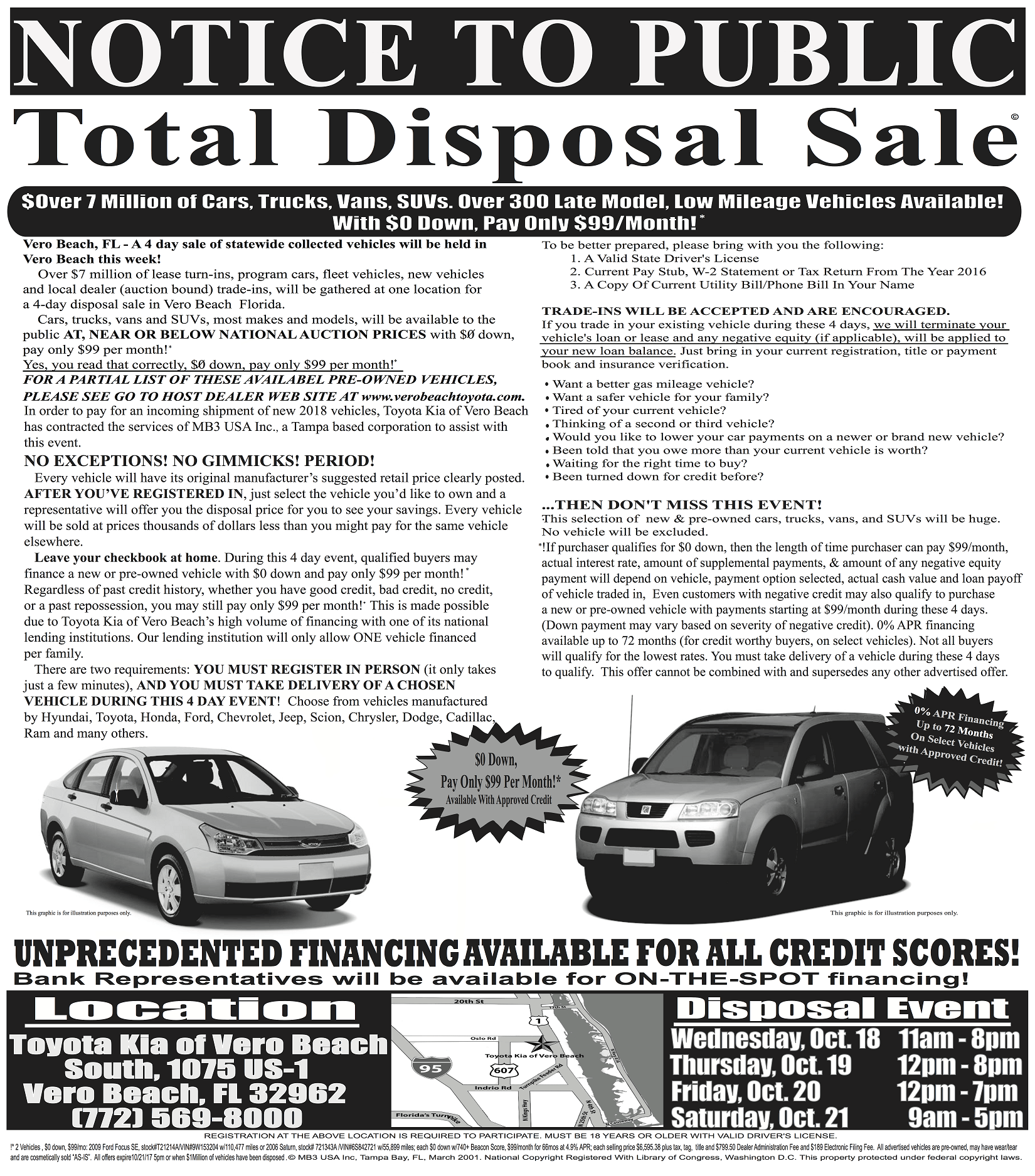 The Total Disposal Sale starts Wednesday, October 18th and ends Saturday, October 21st, so don't miss out! Call (772) 569-8000 to speak with a Sales Specialist now.