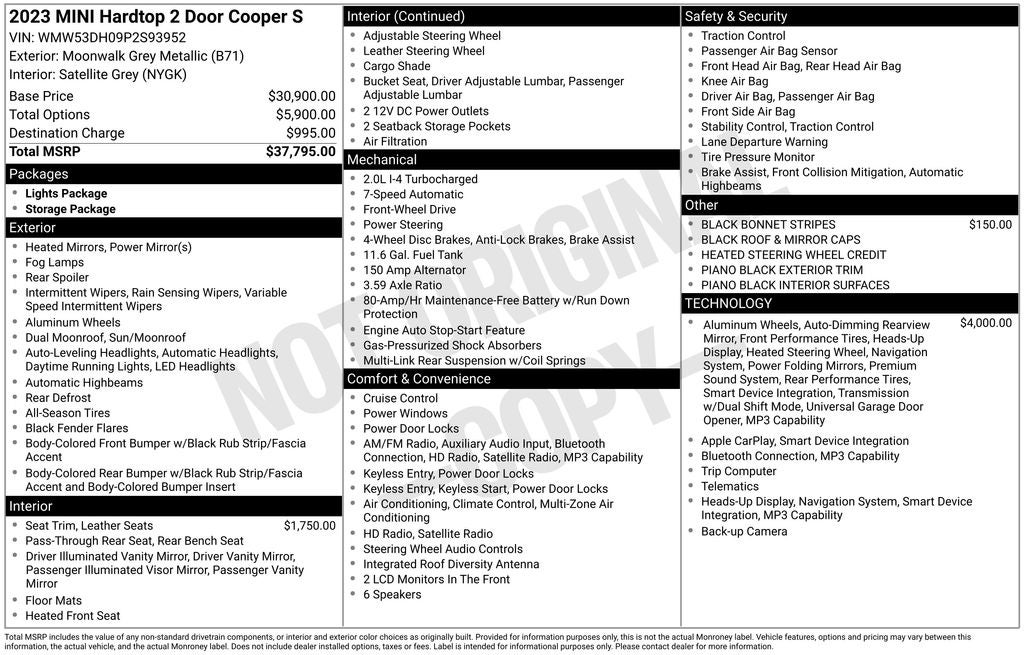 Powered by a robust 2.0L 16V TwinPower Turbo engine and paired with a smooth 7-speed automatic transmission, the Cooper S delivers an exhilarating driving experience. With 28 city / 38 highway MPG, it's also remarkably efficient, making it the perfect companion for your daily commute or weekend adventures.